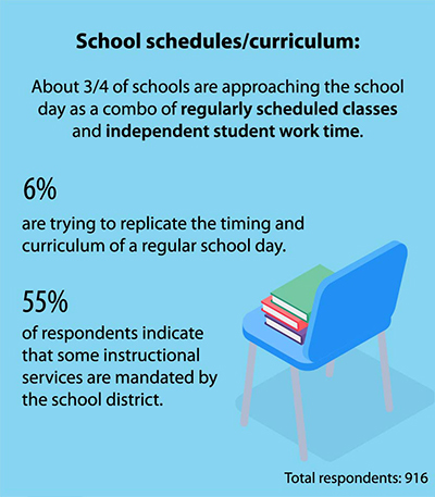• Most schools (about 75 percent) are approaching the school day as a combo of regularly scheduled classes and independent student work time.