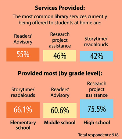 • The most common library services currently being offered to students at home are readers’ advisory (55 percent), research/project assistance (46 percent), and storytime/readalouds (42 percent).