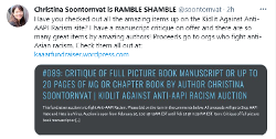 Christine Soontornvat tweeted, “We are a group of Kidlit writers and publishing professionals who are horrified about the intense rise in anti-Asian violence after a year of xenophobic rhetoric and racist attacks. … We are running an auction to raise funds for two organizations that work against anti-Asian racism and racism of all kind.”
