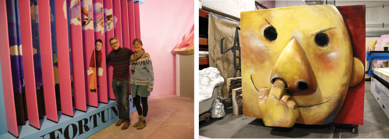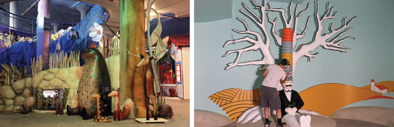 From the left: Through reeds, a view of Frog and Toad is adjacent to critters from I Want My Hat Back; Fabricator Scott Hobart perfects a Hats for Sale display. |