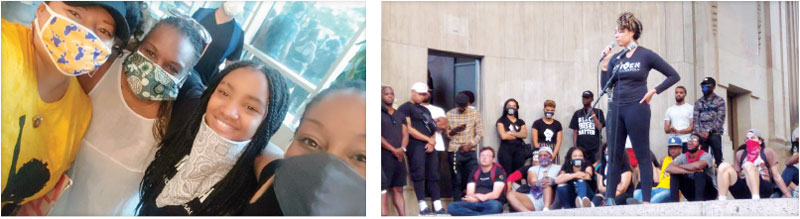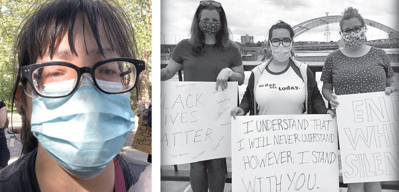 From the left: Mary Westbrook, a children’s librarian at the Free Library of Philadelphia, after being tear-gassed in Philadelphia on June 1; School library media specialist Caitlin Simonse Barnes (right) at protest in Rochester, NY, on May 30. |