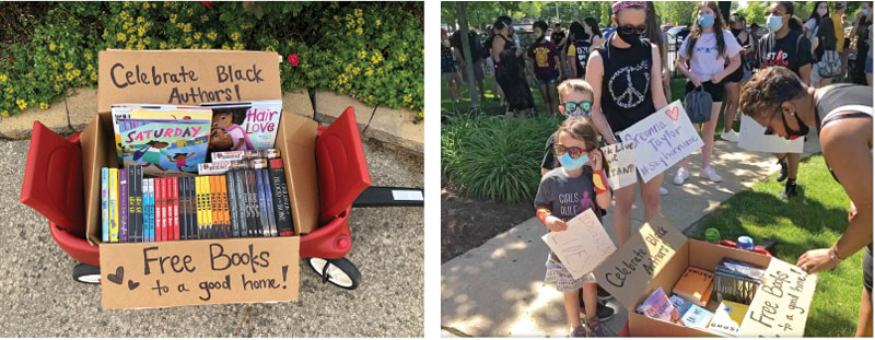 School librarian Clare Lund and her children Connor and Norah attended a protest in Frankfurt, IL, on June 6. The Lunds also brought a box of books by Black creators and gave them away to fellow marchers. |