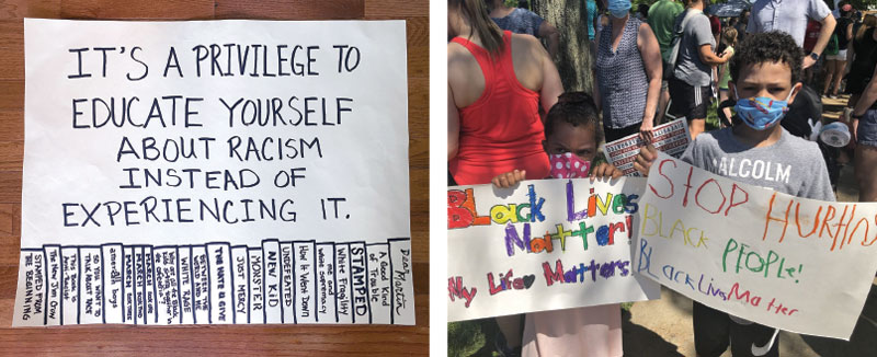 From the left: Middle school librarian Rachel Smith and her 12-year-old daughter brought this sign to a protest in Knoxville, TN, on June 5; Caroline and Nolan Davis marched with their mom, Kristin, the library media specialist at Robinson Elementary in Kirkwood, MO, where the June 6 march was held. |
