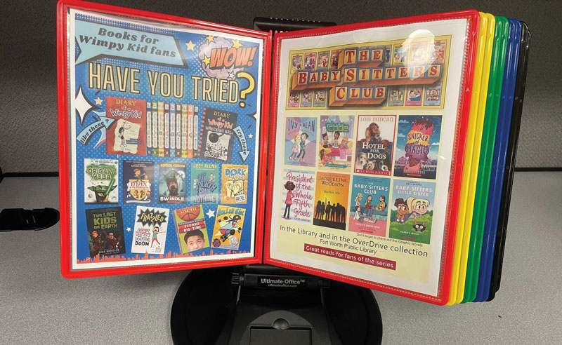 Recently on Twitter and TikTok, Corey showed how she had printed off a wide variety of her RA sheets and put them into a multipage display for browsing right in the stacks. Readers can flip through the lists, like a curated menu that highlights parts of the collections by genre, interest, or other appeal factors. This is another great way to help readers find books. And if you save your templates, you can update and reprint periodically.