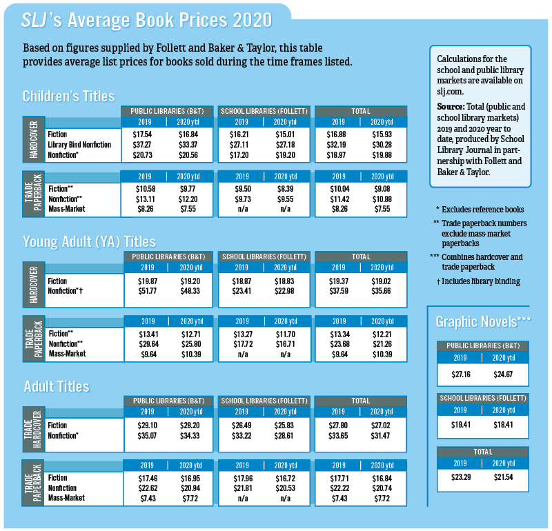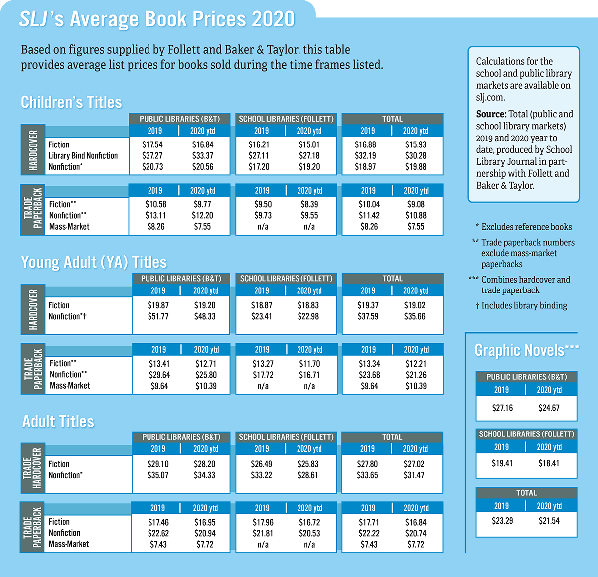 The numbers you put to work every year are here—the list of average book prices for 2019 and 2020 to date, produced in partnership with Follett and Baker & Taylor. We know this data helps you make sound decisions. The data, based on figures supplied by Follett and Baker & Taylor, shows average list prices for all books (including children’s books, young adult books, paperbacks, and hardcover editions) that have been sold (not published) during the time frames listed. Separate calculations have been supplied for the school market and the public library market. Averages are calculated by total number of all book sales divided by the number of books sold.