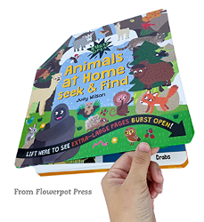 After several years in development, Flowerpot Press just released the “Burst-Open” series for readers ages 3–7. This dynamic, innovative format seems like a standard board book until the reader discovers the surprise. “The page unfolds before the eye into something more than double its original size. You go from a normal-sized book to something that is almost a foot-and-a-half by a foot-and-a-half,” explains Glover. “It's as if the book is bursting out at you.”