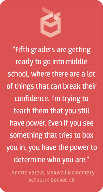 Stereotypes confine kids in boxes, limiting their potential, says Baum, and dispelling biases is a key step toward a more inclusive society. “Fifth graders are so confident with themselves. They’re getting ready to go into middle school where there are a lot of things that can break their confidence,” Barela says. “I’m trying to teach them that you still have power. Even if you see something that tries to categorize you or box you in, you have the power to determine who you are.”