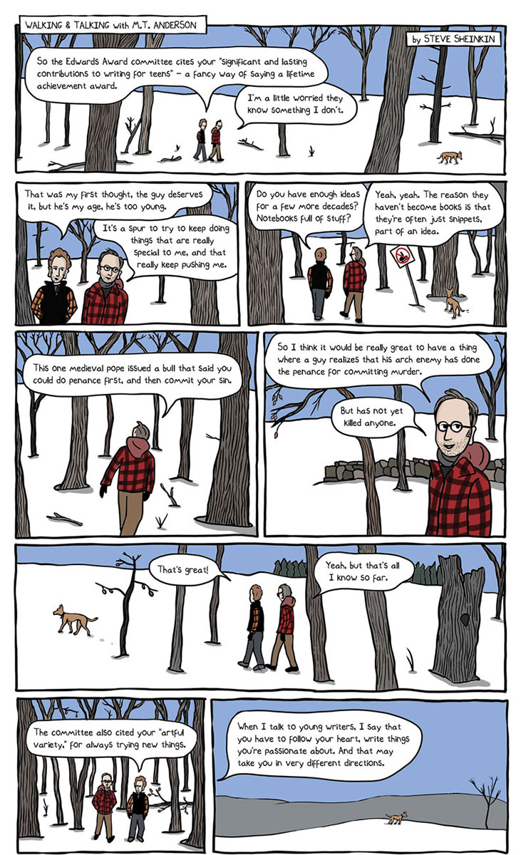 A conversation between M.T. Anderson, the recipient of the 2019 Margaret A. Edwards Award, and Steve Sheinkin, who documents their chat in comic form.