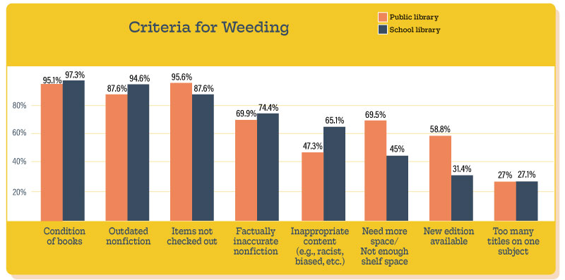 Weeding with purposeWhile deciding what to weed, librarians’ three most common criteria are: condition of books, outdated nonfiction, and items not being checked out, according to the survey. Other criteria include factually inaccurate nonfiction, inappropriate content, and need for more space.